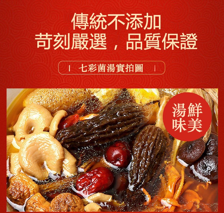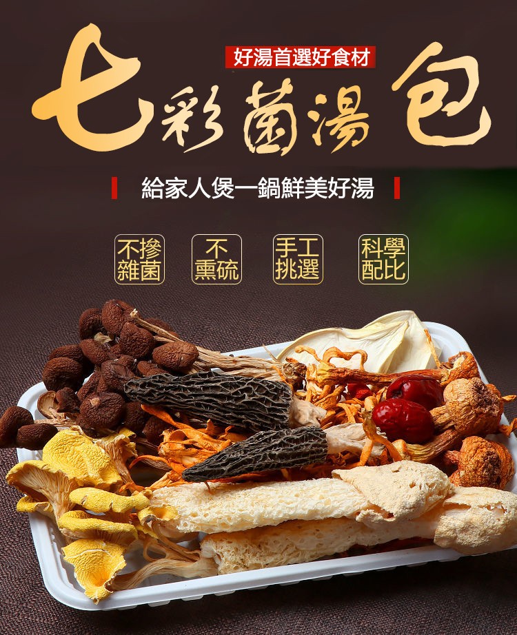 2分鐘前七彩菌湯包,鮮香濃郁,菌體肥嫩,當季乾貨,自然曬乾無硫熏,煲湯首選! - 自然無硫熏,無添加食用更安心! [秋冬 季節必備的七彩野生菌湯包x10=NT$1150 ]
